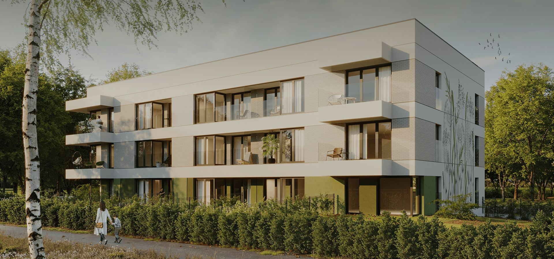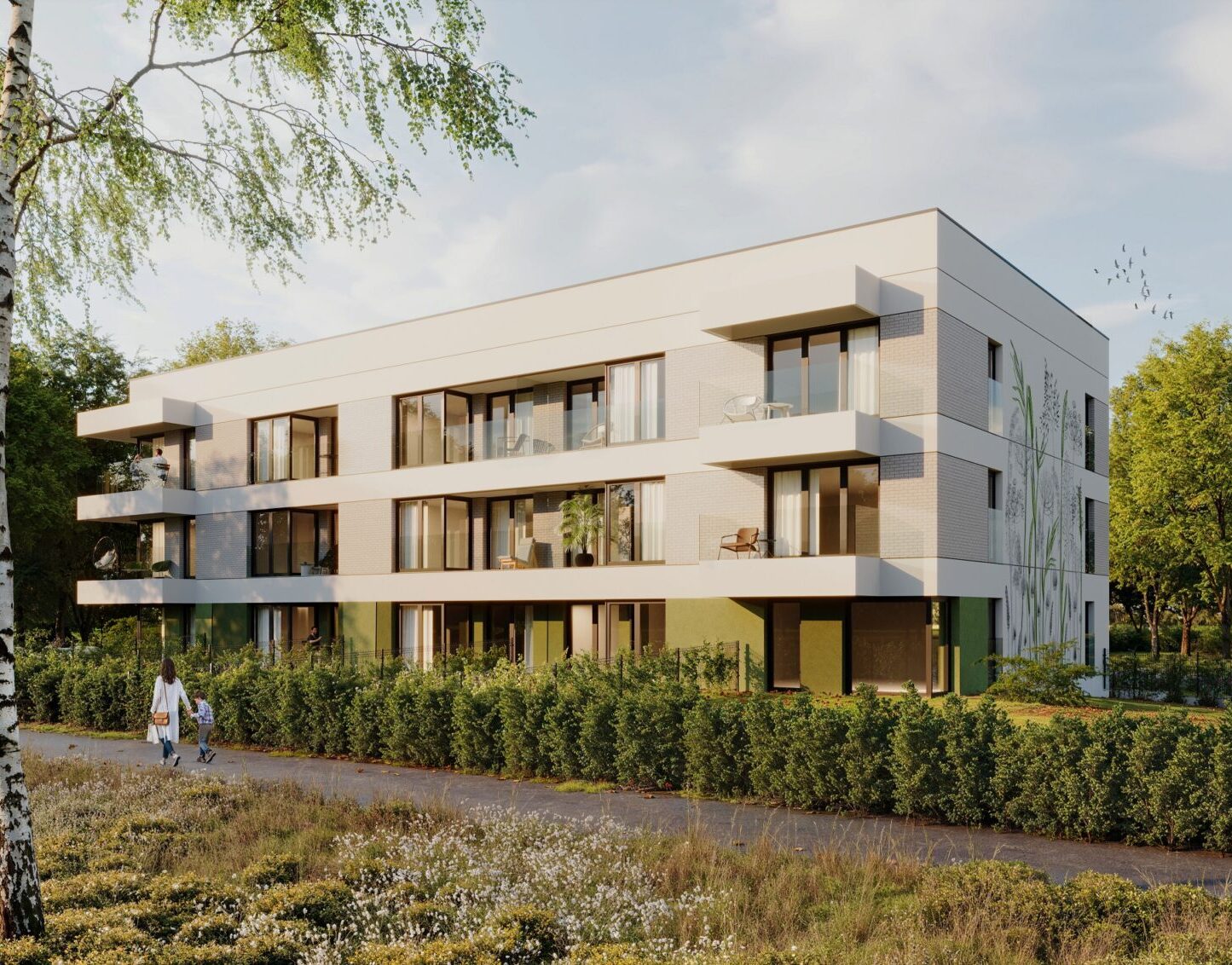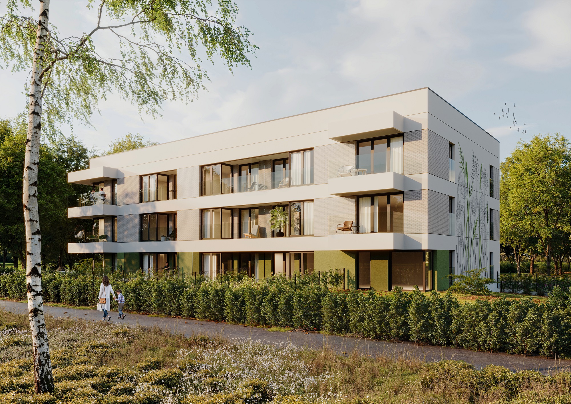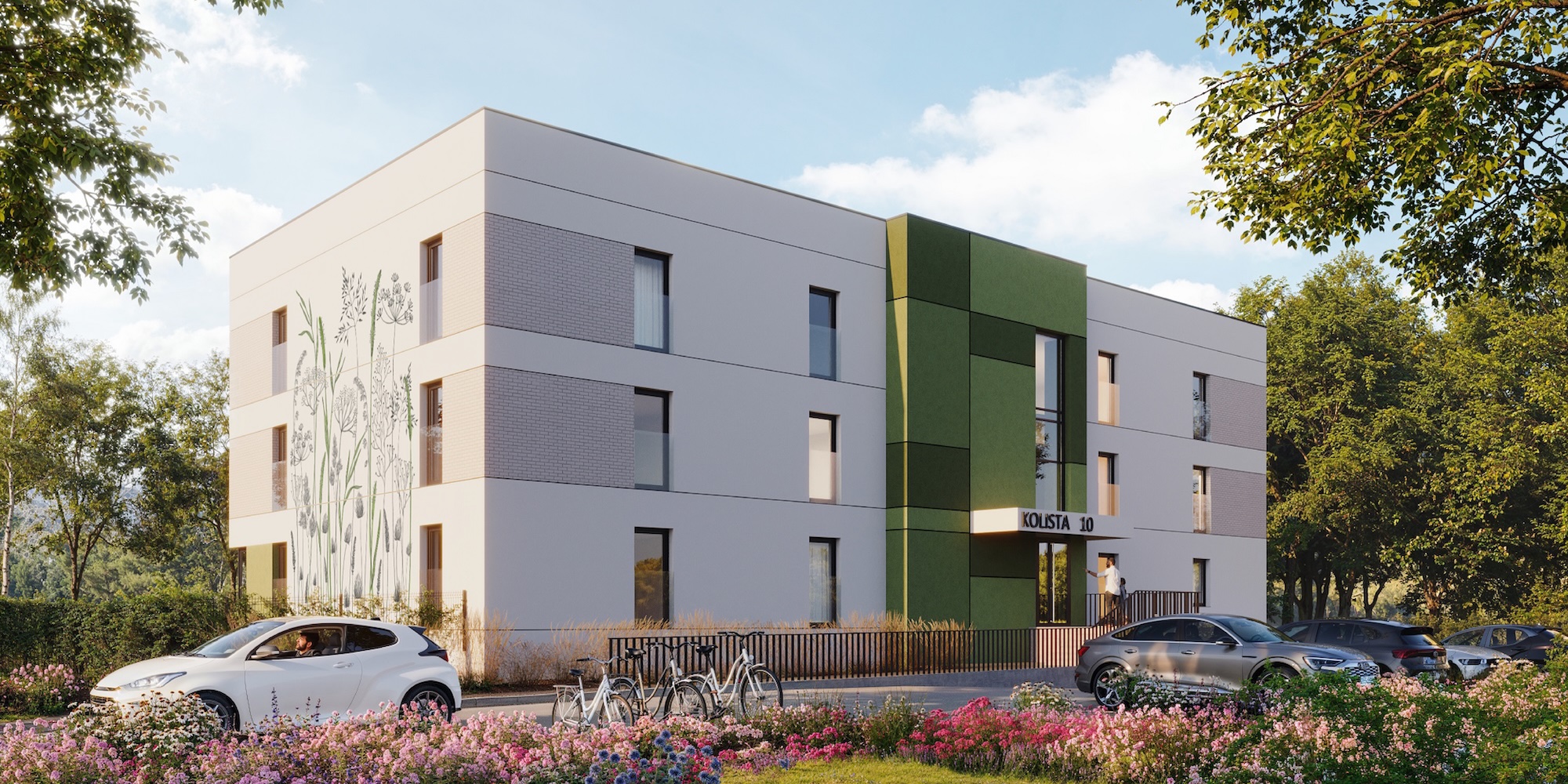 Stworzyliśmy dla Nova Tymotkowa mural na zachodniej ścianie budynku, który nadaje elewacji miejskiego stylu i wpisuje się w sąsiedni krajobraz zielonych terenów wokół inwestycji.