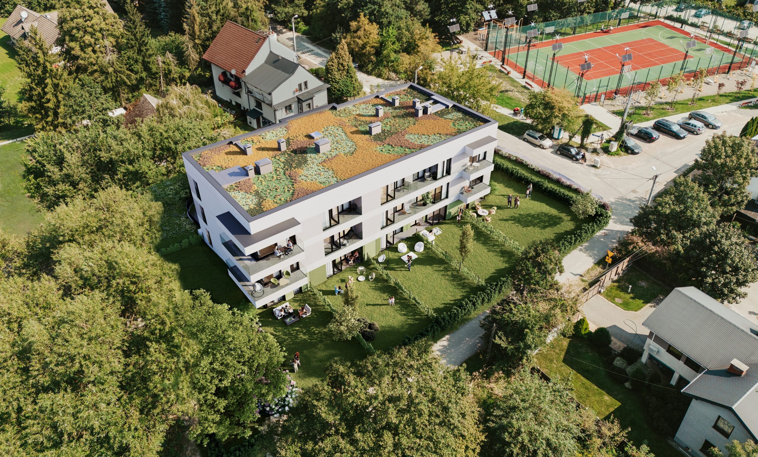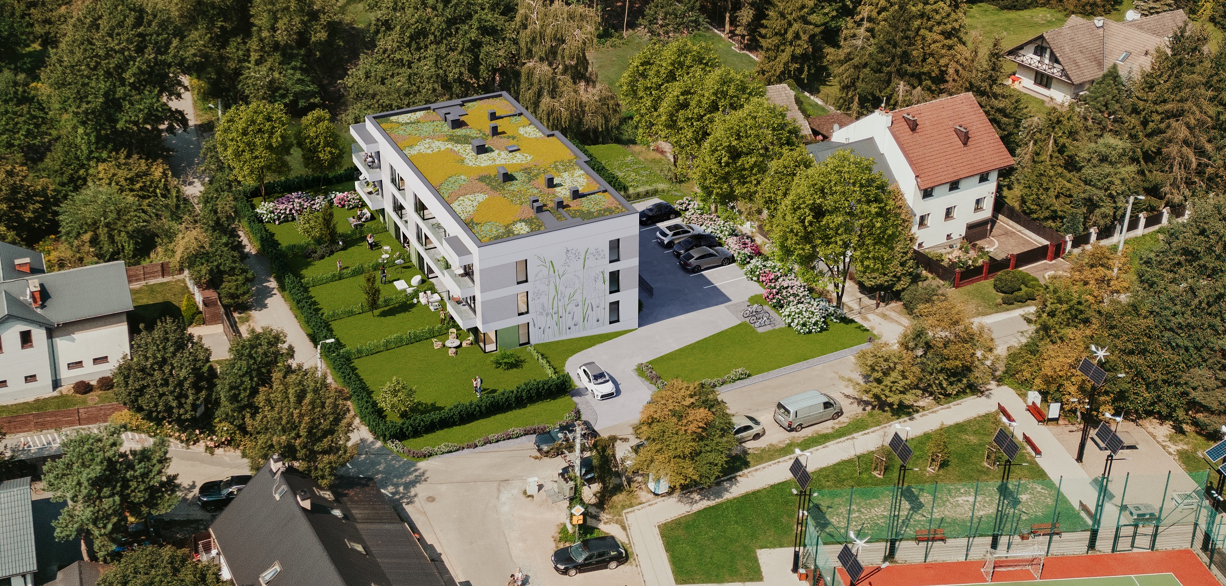 Tu budzi Cię śpiew ptaków, a otaczająca zieleń zaprasza na popołudniowy spacer lub poranny jogging. W sąsiedztwie znajdziesz zarówno park kieszonkowy, jak i boisko sportowe, które zachęcają do aktywnego spędzania czasu z rodziną. Na co dzień docenisz bliskość sklepów, szkół, przedszkoli i punktów usługowych.
